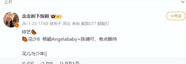 1月23日,有网友爆料杨颖即将参加《花儿与少年》第八季的录制。