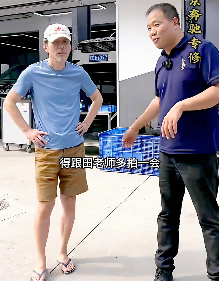 花白胡须、佝偻着腰,安踏T恤+短裤,脚踩一双人字拖,55岁的田小洁站在修车店里,和师傅讨论着奔驰大G的故障,看起来就像个普通小老头,完全没有明星光环。