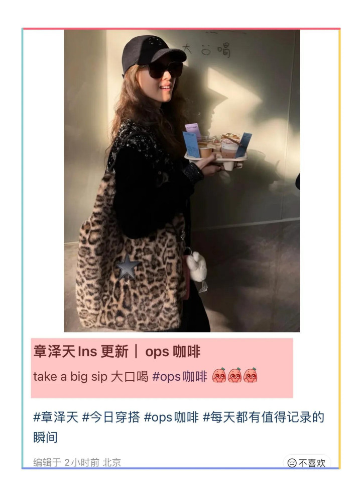 有网友发现,奶茶章泽天更新ins了,这次章泽天在网上晒出一张她喝咖啡的照片!
