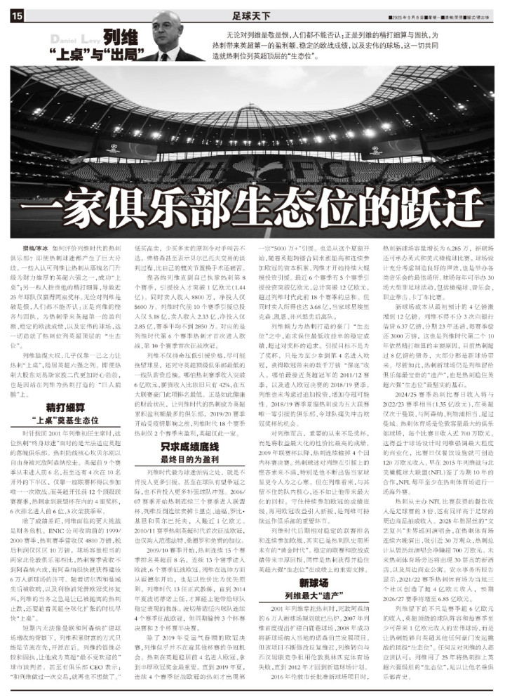 【列维“上桌”与“出局”】无论对列维是敬是恨,人们都不能否认:正是列维的精打细算与固执,为热刺带来英超第一的盈利额、稳定的欧战成绩,以及宏伟的球场,这一切共同造就热刺位列英超顶层的“生态位”。