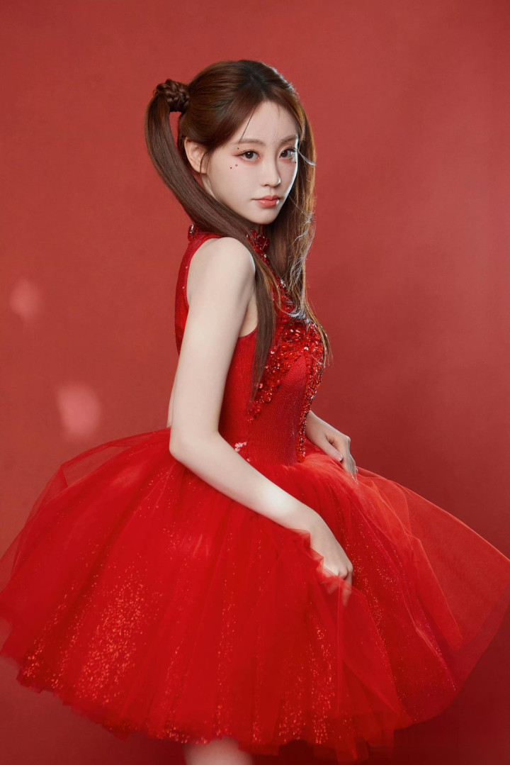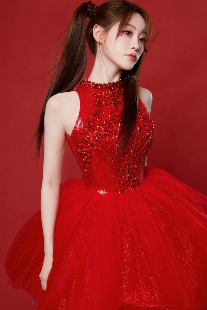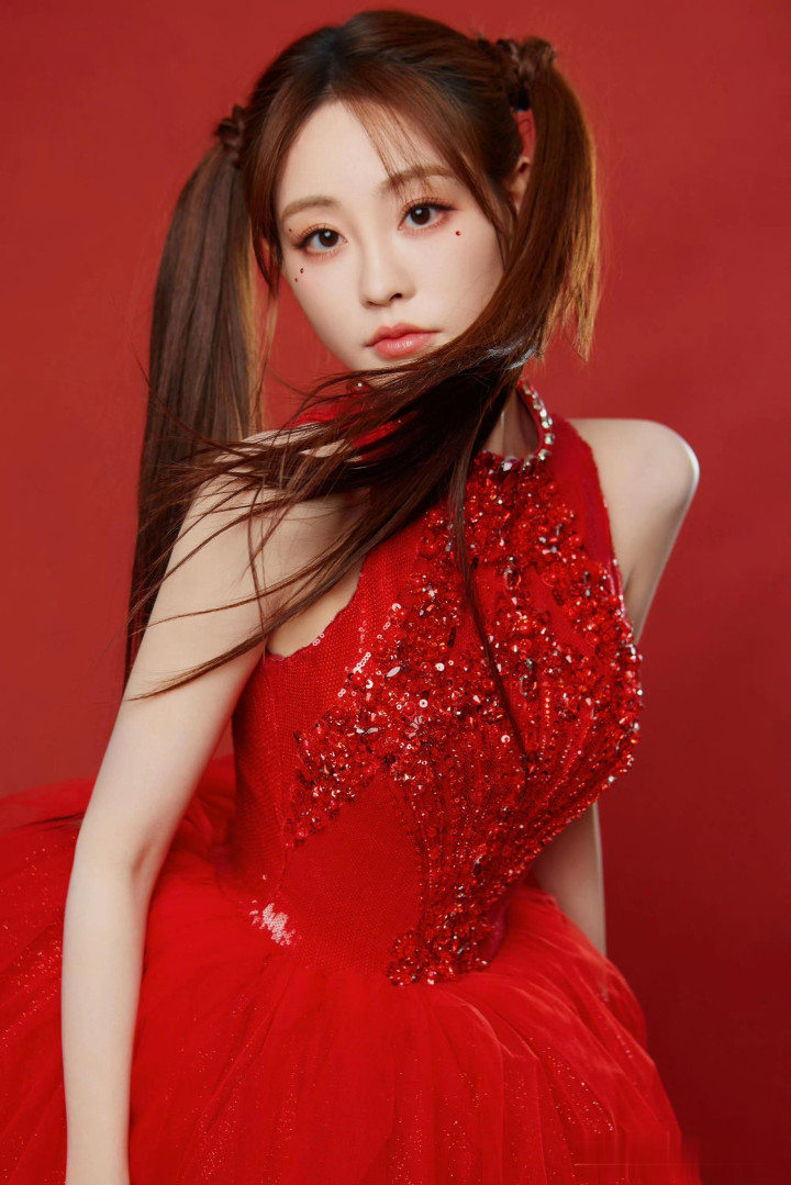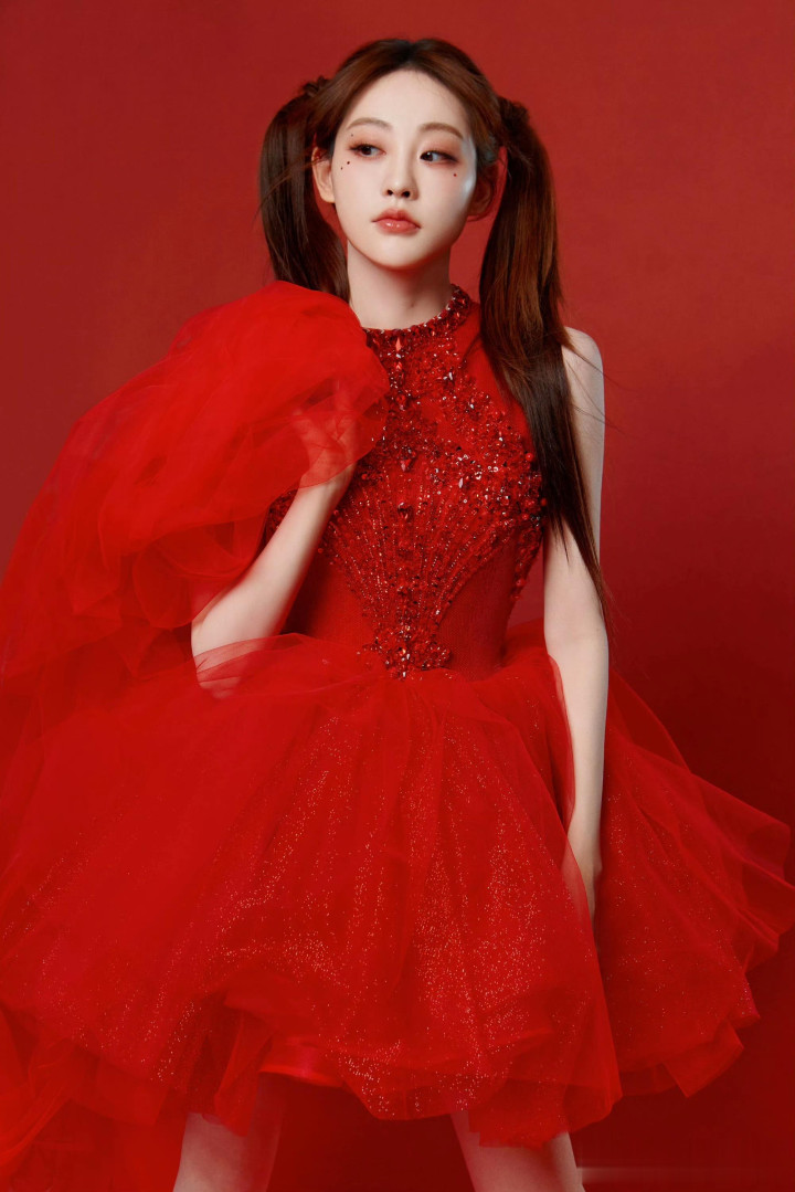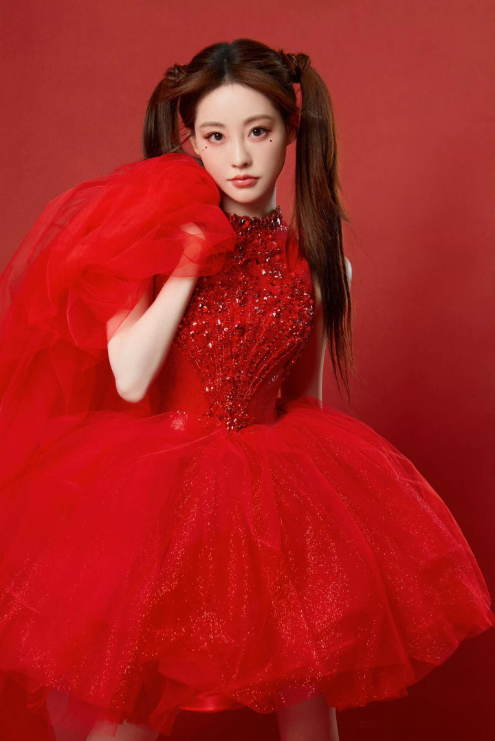 祝绪丹红色亮片纱裙 双马尾妆容灵动吸睛