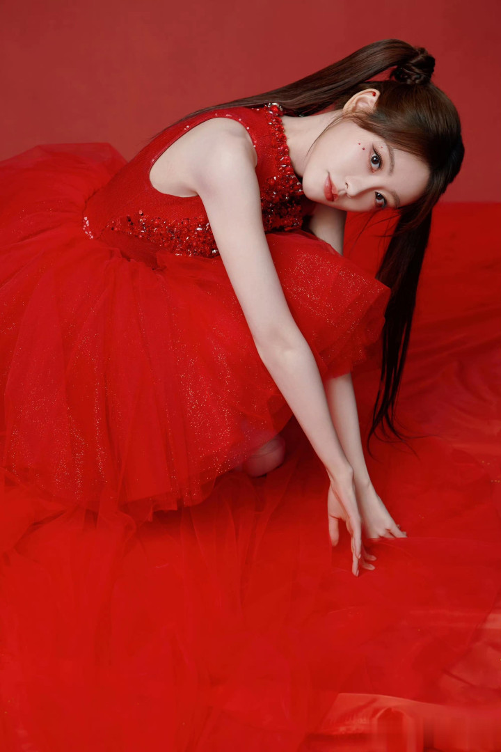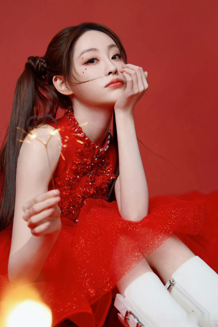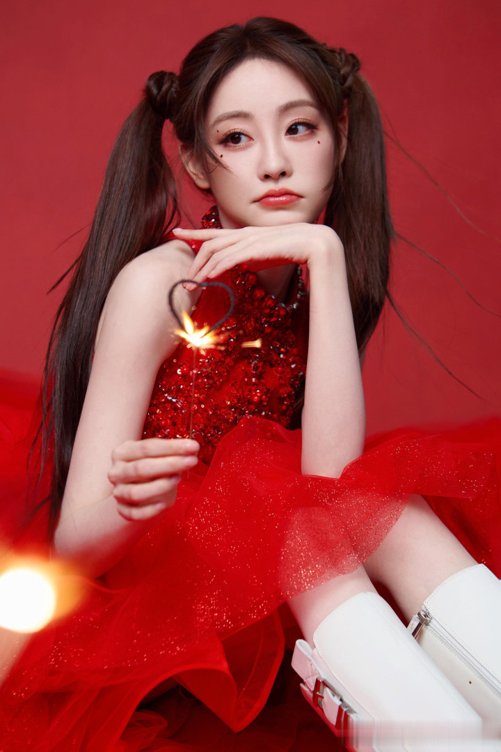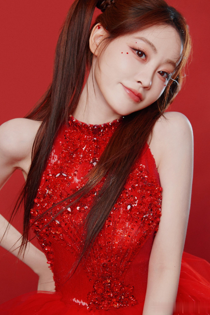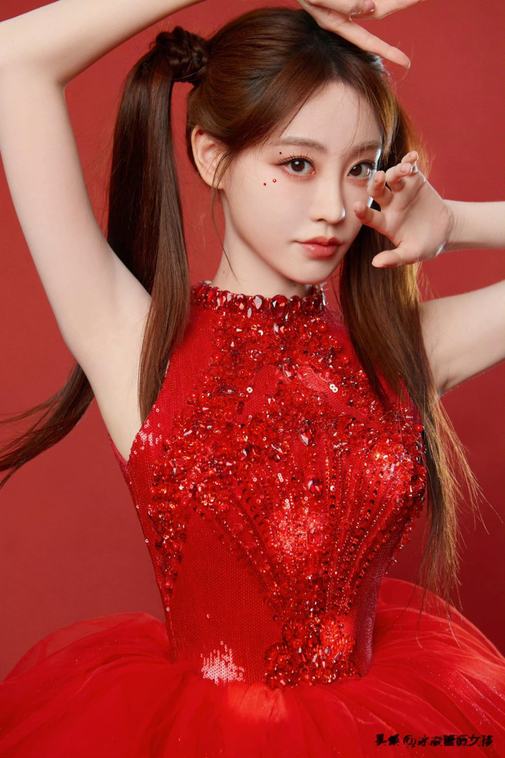 祝绪丹红色亮片纱裙 双马尾妆容灵动吸睛