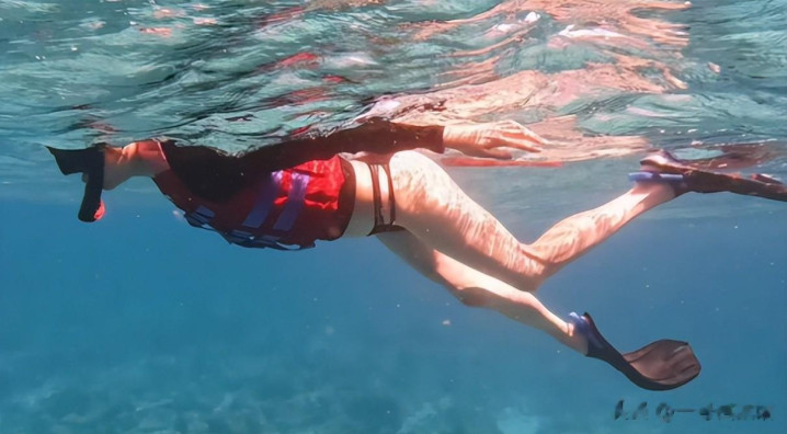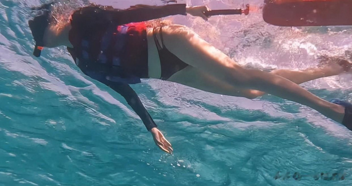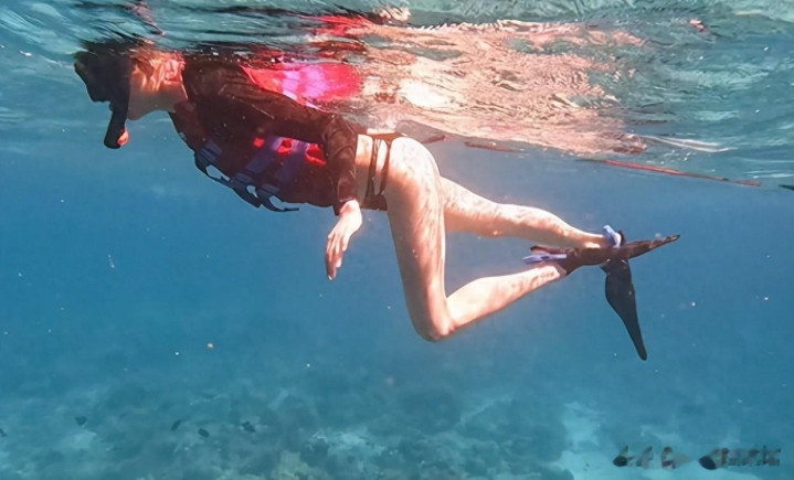 她穿着泳衣在海里浮潜,这下子确实惊到我了,毕竟浮潜这项运动是要经过专门的训练的。