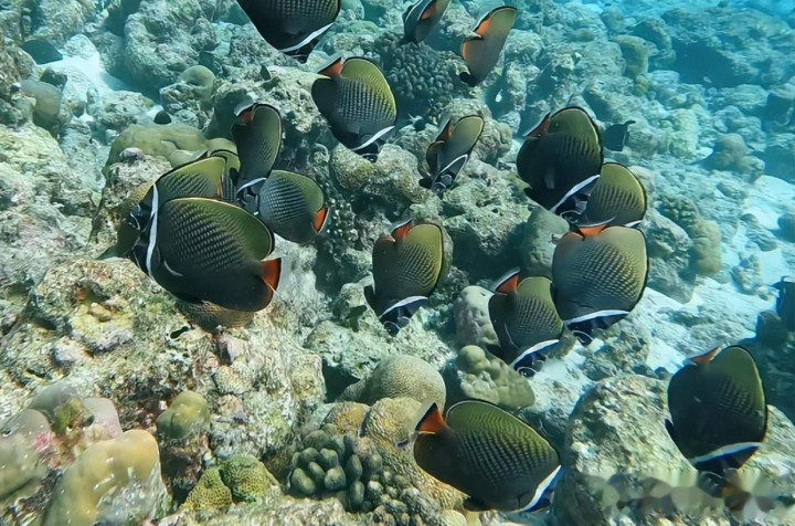 随着镜头的变换,我们不光能看到她浮潜时的情形,也能看到海里游动的鱼儿。