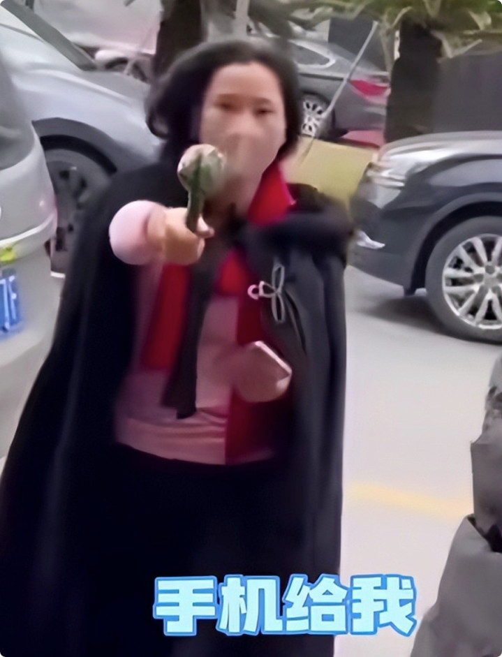 她拍戏时被代拍尾随,她裹着披风、拿着艾草锤上前“理论”,上来就是一副教导主任的模样,吓得对方转身就走。