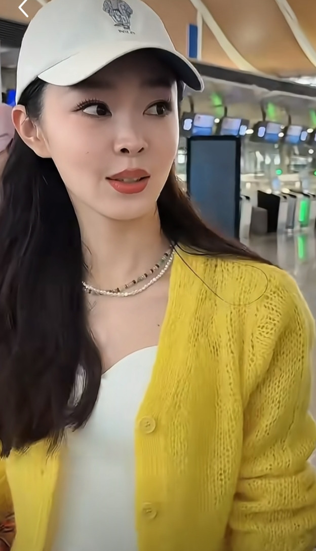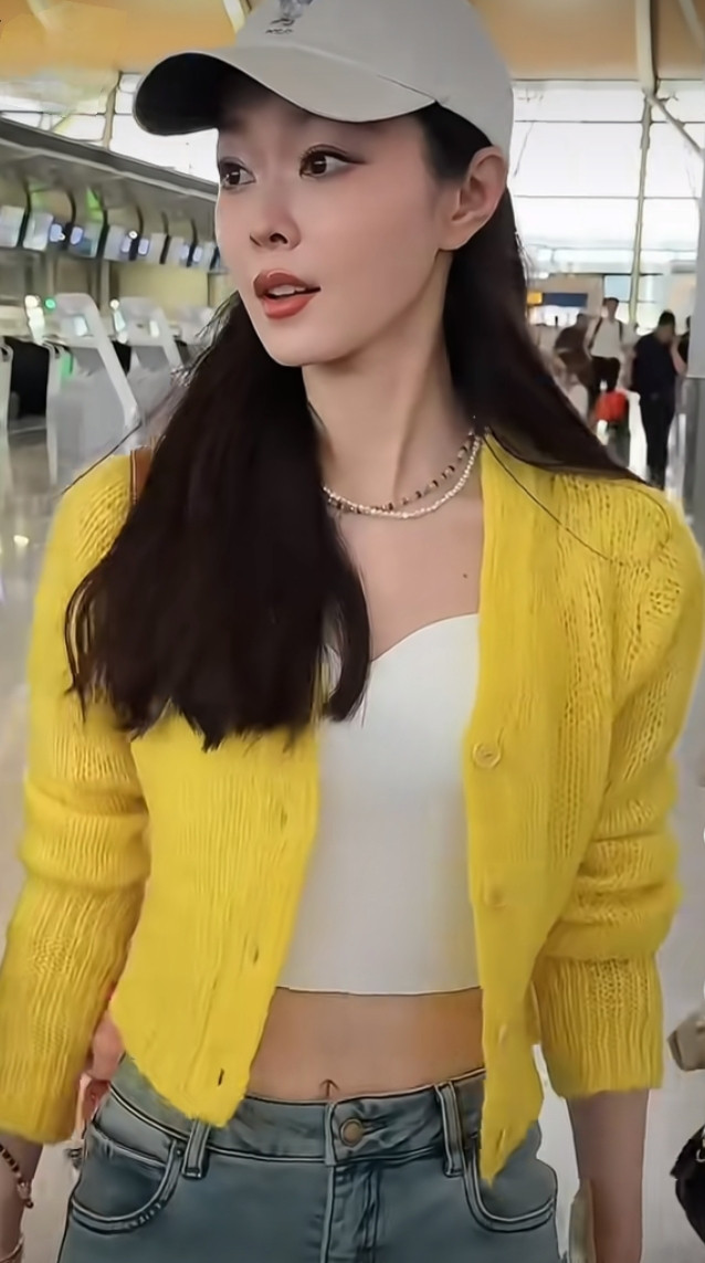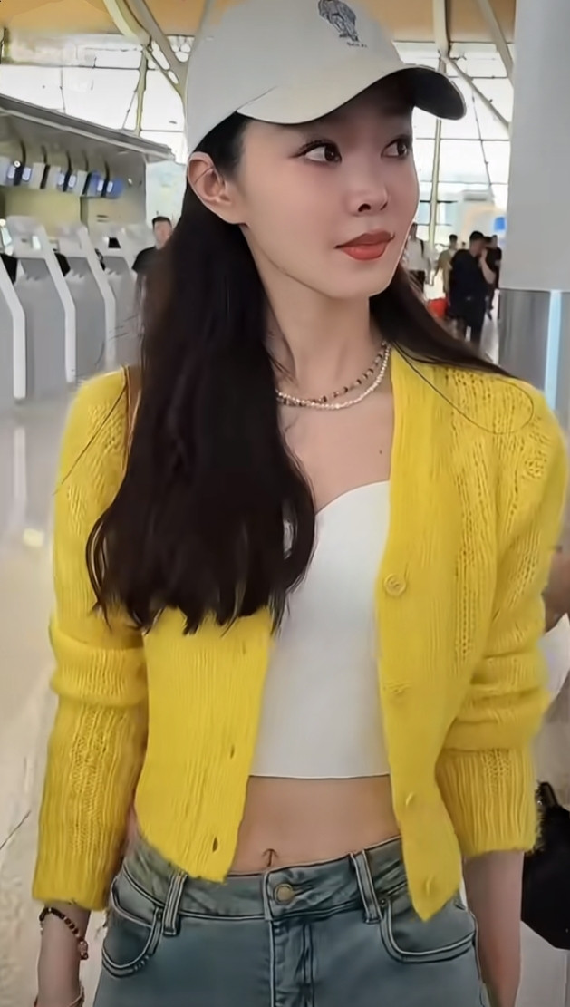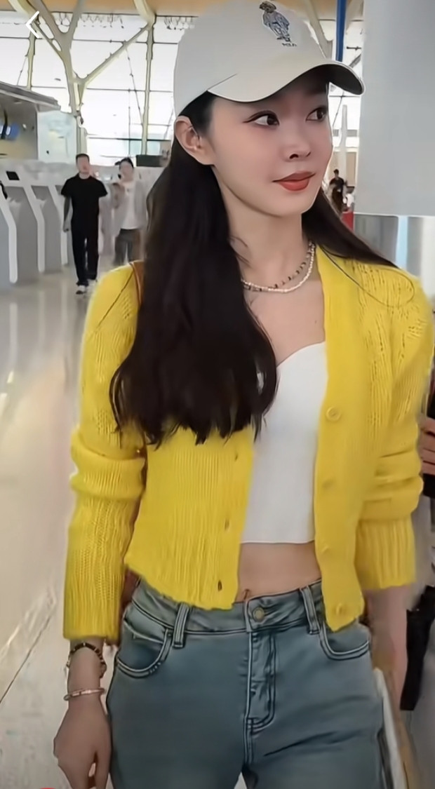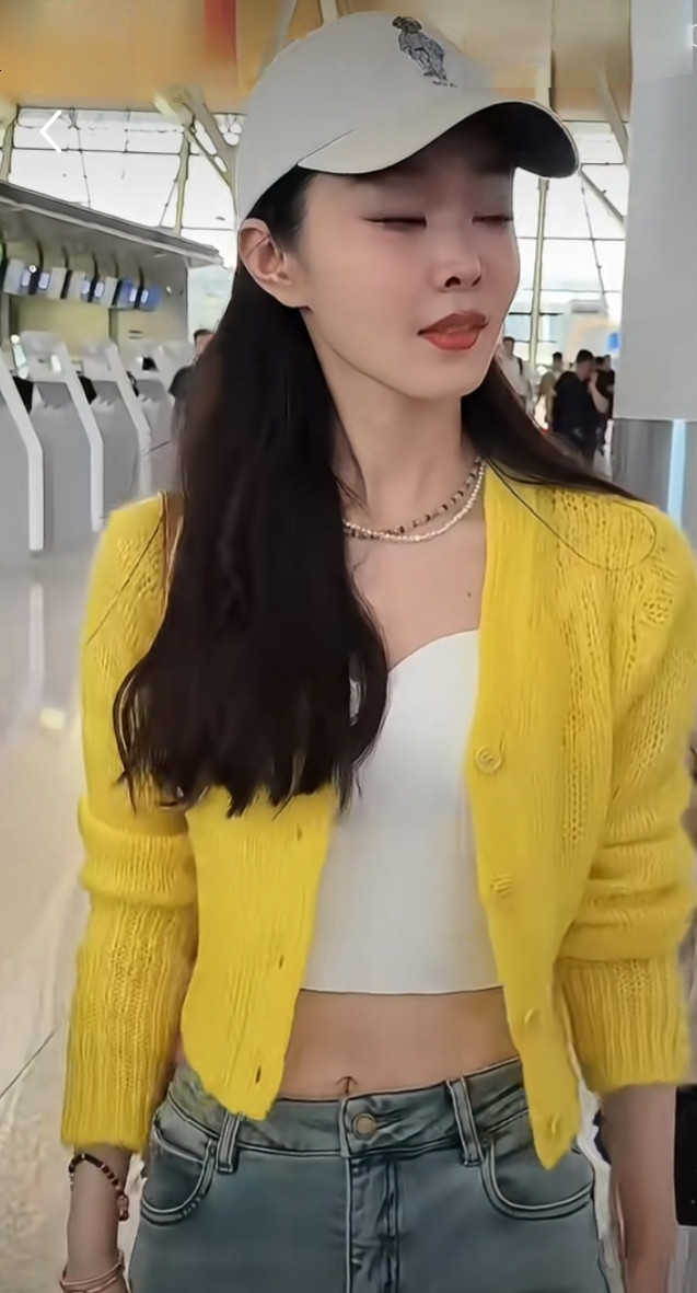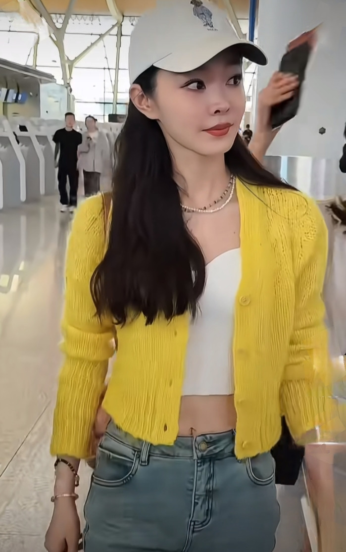 宋轶机场造型清新又撩, 白短上衣露纤细小蛮腰, 搭黄针织开衫美翻