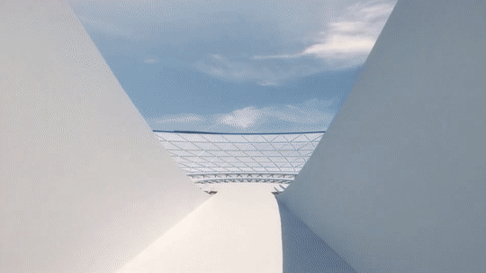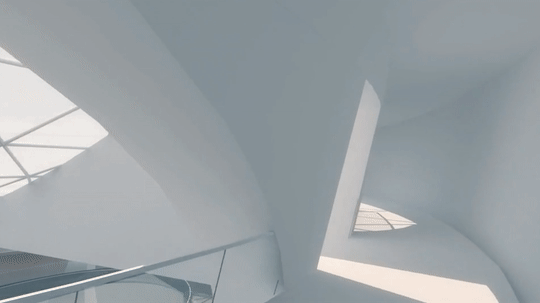 这个部分极具冲击力,也是整个施工过程中我最喜欢逗留的地方。循序渐进的坡道让人在进入悬臂下方时感受到无形的压迫感,这种压迫感在最终抵达“倒转穹顶”时豁然开朗,光线将你的视线吸引向上,天空及宇宙似乎触手可及。这种观感可以媲美我第一次走进巴黎圣母院的体验,让人叹为观止。