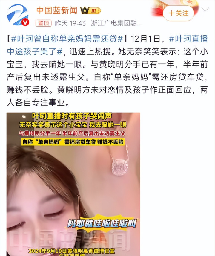 可最近几次直播带货,叶柯又改口,孩子现在是她一个人的,和黄晓明早就没关系了。