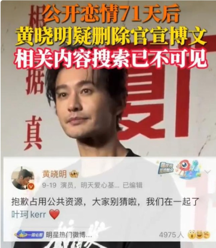 就在官宣70多天后,黄晓明最终忍无可忍,删掉公开两人关系的发文,这个和对方划清界限的行为,在外界眼中,无异于分手。