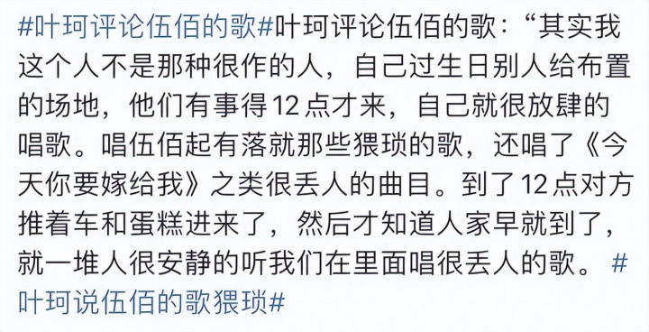 她直播时曾直言,伍佰的歌很“猥琐”,唱陶喆和蔡依林的《今天你要嫁给我》很丢人,还吐槽张惠妹的歌太难唱。